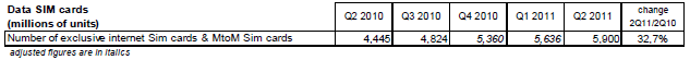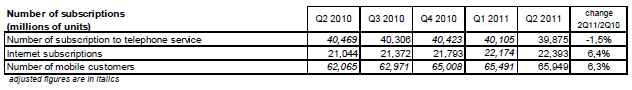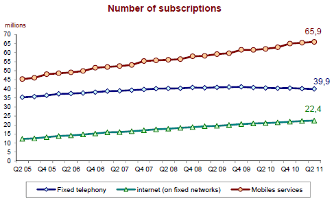 Le nombre de clients des services sur réseaux mobiles (nombre de cartes SIM en service) continue d’augmenter et s’élève à 65,9 millions à la fin du deuxième trimestre 2011. Le taux de croissance annuel se stabilise autour de 6,5% sur le premier semestre 2011 après une année 2010 autour de 5,5%.