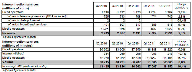 Le revenu tiré des prestations d’interconnexion entre opérateurs sur le marché intermédiaire s’élève à 2,3 milliards d’euros au deuxième trimestre 2011.