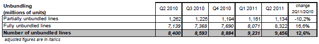 Un peu plus d’une ligne fixe sur quatre (soit 9,5 millions à la fin du deuxième trimestre 2011) est dégroupée. Le dégroupage total qui connait, depuis plusieurs années, une forte expansion, s’accroît de plus d’un million de lignes en rythme annuel (+1,2 million soit +16,6% au deuxième trimestre 2011) et il atteint 8,3 millions de lignes à la fin du mois de juin 2011. A l’inverse, le dégroupage partiel de la ligne (sur laquelle l’abonné conserve un abonnement au service téléphonique classique) recule de façon continue. Le nombre de lignes partiellement dégroupées est de 1,1 million à la fin du deuxième trimestre 2011 (-10,2% sur un an).