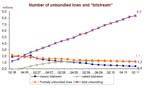 Les opérateurs alternatifs peuvent aussi acheter auprès de l’opérateur historique des accès en «bitstream nu» sur lesquels le client final ne dispose plus de l’abonnement au service téléphonique classique. Le nombre de ces lignes se situe sur un niveau de 1,2 million et évolue peu depuis la fin de l’année 2008.