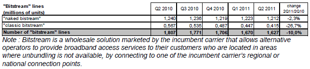 Le nombre de lignes en «bitstream classique» et en «IP national» avec lesquelles l’abonné conserve un abonnement téléphonique classique, est de 415 000 à la fin du deuxième trimestre 2011 et il se réduit de façon continue (-26,7% sur un an).