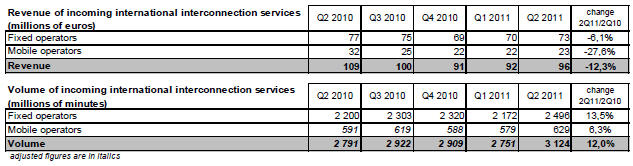 Le revenu des opérateurs au titre des prestations d’interconnexion internationale entrante est de 96 millions d’euros au deuxième trimestre 2011. Ces prestations représentent un volume total de 3,1 milliards de minutes dont 80% à destination du réseau fixe français.