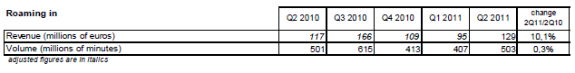 Le revenu généré par les clients des opérateurs mobiles étrangers pour leurs appels passés en France atteint 129 millions d’euros au deuxième trimestre 2011. Ce revenu s’accroît de 10,1% sur un an alors qu’il reculait depuis 2005 en raison de l’encadrement des tarifs du roaming-in au niveau européen qui impose aux opérateurs mobiles des baisses de tarifs. Ainsi, au 1er juillet 2010, la baisse des tarifs régulés était de 9% pour les communications émises à l’étranger et de 21% pour les appels reçus en situation d’itinérance à l’étranger.