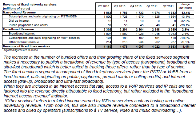 Le revenu des services fixes (téléphonie et internet sur le réseau fixe) représente 4,0 milliards d’euros au deuxième trimestre 2011. Il se contracte nettement pour le deuxième trimestre consécutif (-4,4% sur un an) en raison du fort recul du revenu des services fixes bas débit que ne compense pas la hausse du revenu généré par les services fixes à haut et très haut débit.