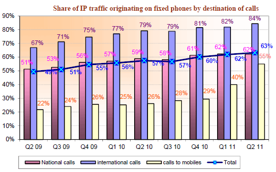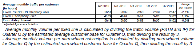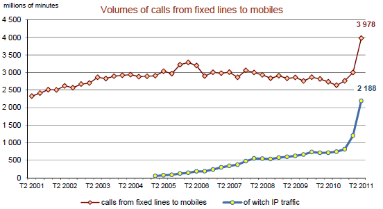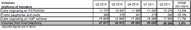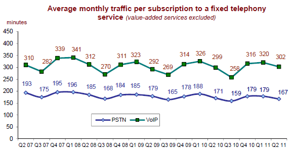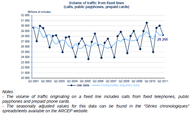 Le volume de trafic de l’ensemble de la téléphonie fixe (incluant celui de la publiphonie et des cartes téléphoniques) atteint 28,3 milliards de minutes au deuxième trimestre 2011. La voix sur large bande (VLB) représente près des deux-tiers de l’ensemble des communications émises depuis les postes fixes et cette part (63% du trafic du deuxième trimestre 2011) augmente continument.