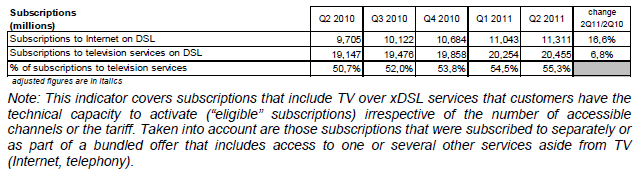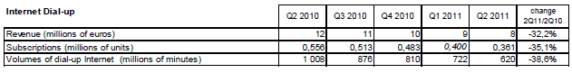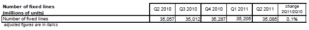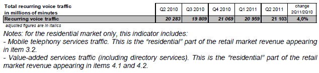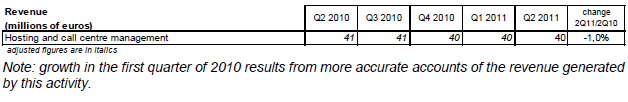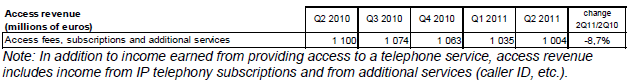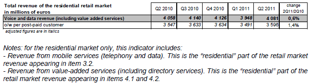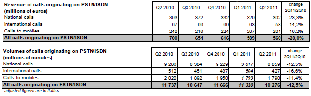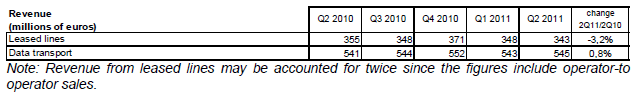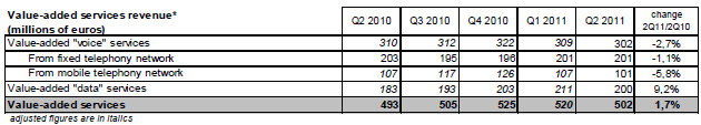 Le revenu des services à valeur ajoutée représente 531 millions d’euros au deuxième trimestre 2011 (+0,7% sur un an). Le revenu des services de capacité (liaisons louées et transport de données sur réseaux fixes) atteint 889 millions d’euros et diminue de 0,8% au deuxième trimestre 2011 alors qu’il augmentait depuis trois ans.