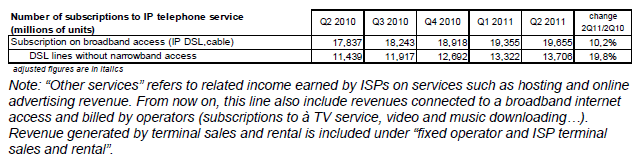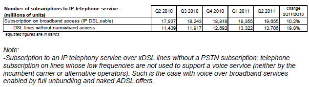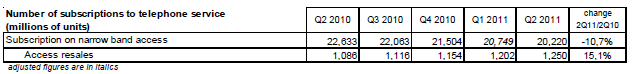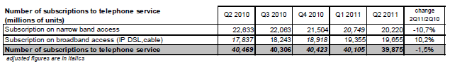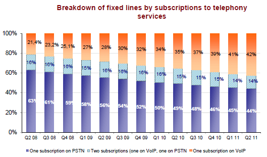 Le nombre d’abonnements à un service de téléphonie fixe s’élève à 39,9 millions à la fin du deuxième trimestre 2011 et décroît depuis le milieu de l’année 2010. La baisse du nombre d’abonnements téléphoniques sur des accès bas débit se poursuit sur un rythme annuel d’environ 2,5 millions depuis le début de l’année 2010 (-2,4 millions pour 20,2 millions d'abonnements à fin juin 2011). Depuis quatre trimestres, le nombre de souscriptions à la VLB (19,7 millions à fin juin 2011) augmente moins rapidement (moins de deux millions en rythme annuel) qu’au début de l’année 2010 (+2,6 millions) et ne compense plus la baisse du nombre des abonnements bas débit. En effet, de plus en plus de clients ne conservent pas d’abonnement RTC lors de leur souscription à un service de voix sur large bande (+2,3 millions sur un an pour les lignes DSL sans abonnement RTC) et ainsi le nombre de "doubles" abonnements (un RTC et un VLB) diminue depuis cinq trimestres (-622 000 lignes sur un an au deuxième trimestre 2011, 14% des lignes) au profit des abonnements en VLB seule, présents désormais sur 42% des lignes fixes. Ce succès de la VLB bénéficie aussi au dégroupage total en forte expansion (8,3 millions de lignes à la fin du deuxième trimestre 2011 et un accroissement de 1,2 million de lignes en un an). A l’inverse, le nombre de lignes partiellement dégroupées et en bitstream classique décline depuis plusieurs années.