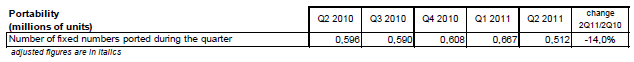 Le nombre de numéros de téléphonie fixe conservés à la suite d’un « portage du numéro » d’un opérateur à un autre est de 512 000 au cours du deuxième trimestre 2011. Depuis le début de l’année 2010, le nombre de numéros « portés » diminue chaque trimestre (-14,0% au deuxième trimestre 2011).