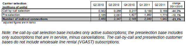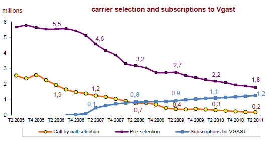Le développement rapide de la téléphonie sur large bande au cours des cinq dernières années a entraîné un reflux continu, des offres de téléphonie basées sur la sélection du transporteur. Le nombre d’abonnements à la présélection (1,8 million à la fin du deuxième trimestre 2011) s’est réduit de près de 400 000 en un an. Le nombre d’abonnements à des offres de sélection appel par appel a pratiquement été divisé par deux en un an et n’est plus que de 168 000.