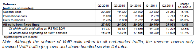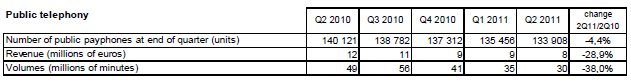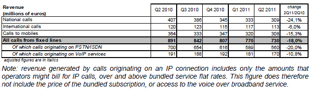 Près de neuf appels sur dix vers les services « voix et télématique » sont émis depuis les postes fixes. Le volume total de ces appels (2,0 milliards de minutes au deuxième trimestre 2011) diminue également (-12,5% sur un an) et ce, que l’origine de ces appels soit fixe (-12,9%) ou mobile (-9,9%).
