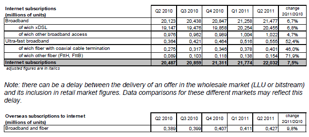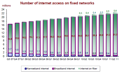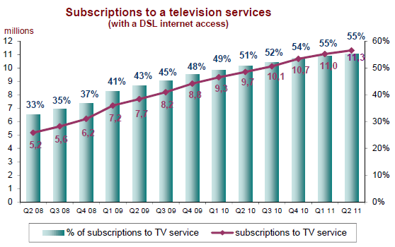Le nombre d’accès à internet à haut et à très haut débit (ADSL, câble, fibre…) s’élève à 22,0 millions à la fin du deuxième trimestre 2011. Le nombre de ces accès s’accroît sur une cadence annuelle de 1,5 million depuis le début de l’année 2011 (+7,5% en un an au deuxième trimestre). Les abonnements par DSL (20,5 millions) représentent 95% de ces accès à haut débit et près de six accès DSL sur dix (soit 11,3 millions) sont couplés avec un service de diffusion de télévision. Le nombre d’accès à très haut débit est de 555 000 (+52,4% sur un an).