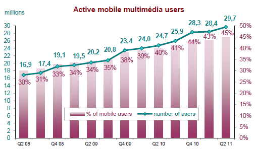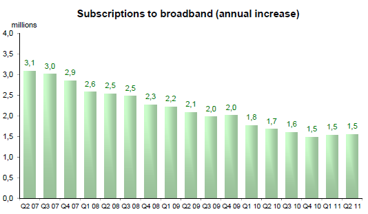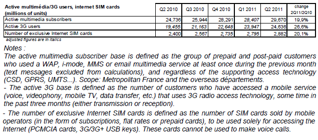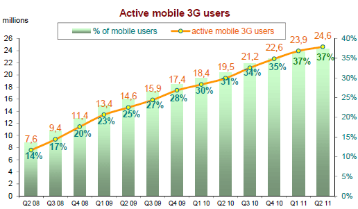 Le nombre d’utilisateurs des réseaux 3G (24,6 millions), qui augmentait rapidement depuis deux ans (entre +6% et +10% chaque trimestre), ne progresse que de 3% entre la fin mars 2011 et la fin juin 2011.