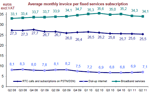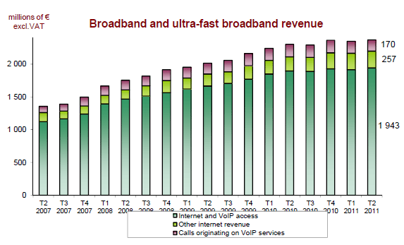 Le marché des services à haut et très haut débit (téléphonie fixe sur large bande et accès à internet) représente 2,4 milliards d’euros au deuxième trimestre 2011. Ces services sont en croissance continue (+2,9% sur un an) et leur contribution au revenu des services fixes (59%) augmente graduellement.