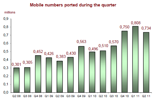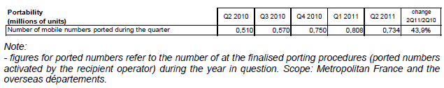 Depuis le début de l’année 2011, le nombre de numéros portés a considérablement augmenté : 730 000 numéros mobiles ont été conservés par portage d’un opérateur à un autre au cours du deuxième trimestre 2011, soit une progression de 43,9% en un an après un pic de croissance annuelle à 62,9% au premier trimestre 2011.