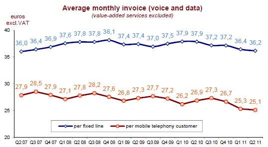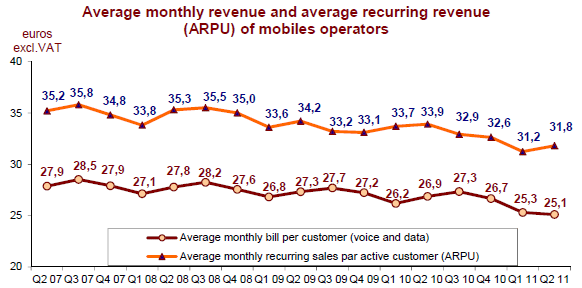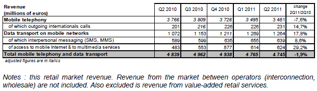 Le revenu des services mobiles est de 4,7 milliards d’euros au deuxième trimestre 2011. Jusque-là croissant, il est en baisse pour la première fois (-1,9% sur un an), avec une baisse plus importante du revenu de la voix (-7,6% sur un an, soit un recul de trois points du taux de croissance annuel en un trimestre) qui représente 73% du revenu des services mobiles.