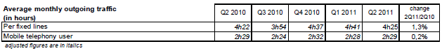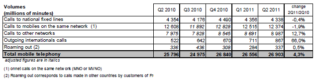 La consommation de minutes vers les clients de réseaux mobiles tiers reste dynamique (+12,7% au deuxième trimestre 2011) grâce à la commercialisation de forfaits de communications illimitées vers tous les opérateurs (quel que soit le réseau mobile appelé en France).