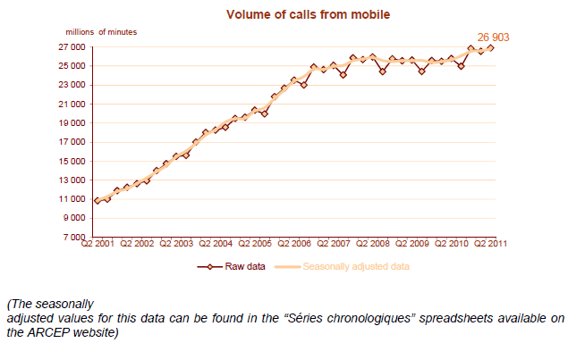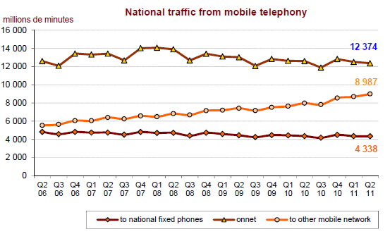 Le volume des communications téléphoniques mobiles atteint 26,9 milliards de minutes. Il augmente pour le cinquième trimestre consécutif, et sur un rythme supérieur à 4% par an au cours des trois derniers trimestres (+4,3% en un an au deuxième trimestre 2011).