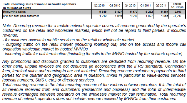 - Le revenu récurrent total des opérateurs de réseaux ne couvre pas les revenus perçus par les opérateurs de téléphonie mobile sans réseau auprès de leurs clients.