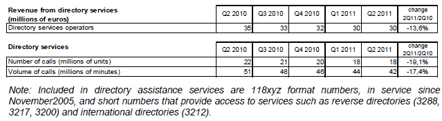 Le revenu des services de renseignements téléphoniques s’élève à 30 millions d’euros au deuxième trimestre 2011. Ce revenu s’érode depuis le début de l’année 2010 sur un rythme annuel supérieur à 10% (-13,6% sur un an au deuxième trimestre 2011).