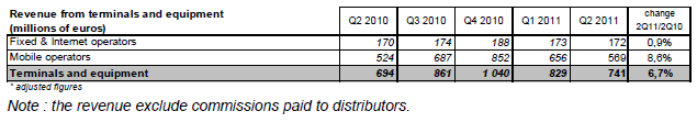 Le revenu des ventes et locations de terminaux atteint 741 millions d’euros au deuxième trimestre 2011. Plus des trois-quarts de ces ventes se rapportent à des terminaux mobiles, celles-ci représentent 569 millions d’euros (+8,6% sur un an).
