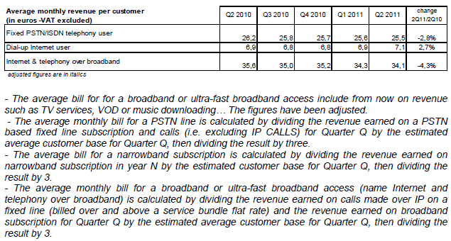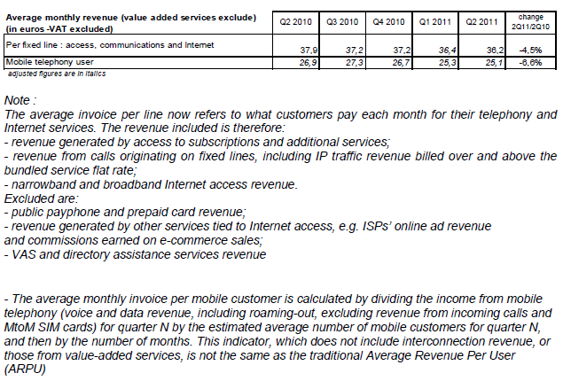 Au final, elle est calculée en divisant le revenu des communications depuis les lignes fixes (revenus de l’accès et des communications téléphoniques et des accès à l’internet) pour le trimestre N par une estimation du parc moyen de lignes fixes du trimestre N rapporté au mois.