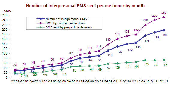 Le nombre de « SMS » émis au cours du deuxième trimestre 2011 s’élève à 35,5 milliards, dont 88,7% proviennent de clients titulaires de forfaits. Les clients des opérateurs mobiles ont envoyé 1,8 milliard de SMS de plus qu’au premier trimestre 2011, soit en moyenne 9 SMS environ de plus par client et par mois. Chaque client des opérateurs mobiles a envoyé en moyenne 198 SMS par mois au cours du deuxième trimestre 2011 contre 139 un an auparavant. Ceci s’explique toujours par la mise en place d’offres d’abondance par les opérateurs mobiles qui permettent l’envoi de SMS illimités.