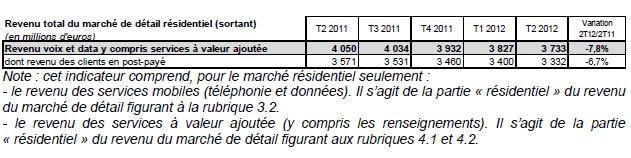 Le revenu total des opérateurs de communications électroniques sur les marchés de gros et de détail s'élève au deuxième trimestre 2012 à 12,7 milliards d'euros (-4,3% sur un an). Sur le seul marché de détail, le revenu atteint 10,5 milliards d'euros en baisse de 3,4% sur un an.