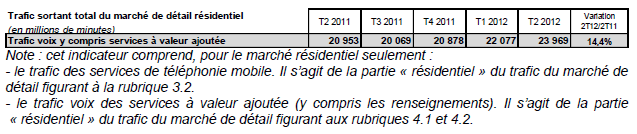 Le volume des communications téléphoniques mobiles s'élève à 29,7 milliards de minutes au deuxième trimestre 2012, soit 2,9 milliards de minutes supplémentaires en un an, ce qui représente en moyenne huit minutes supplémentaires par client et par mois. Après une croissance annuelle en léger retrait au quatrième trimestre 2011 (-0,4%), la consommation de minutes reprend et augmente de 11,0% au deuxième trimestre 2012, un taux jamais atteint en cinq ans. La croissance annuelle du trafic mobile vers les téléphones fixes s'envole (+14,1% au deuxième trimestre 2012), gagnant environ dix points en seulement un trimestre au premier trimestre 2012 et trois points et demi au deuxième trimestre après plus de cinq années de décroissance, mais sa part dans le volume de minutes total stagne, et est d'environ 17% depuis plusieurs années, une proportion qui était de l'ordre de 30% en 2004.