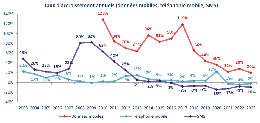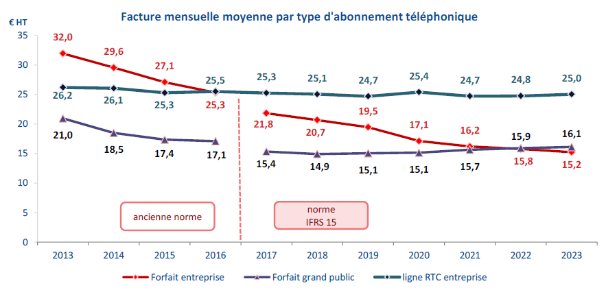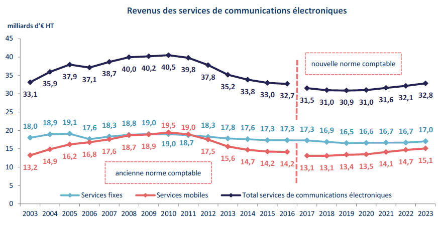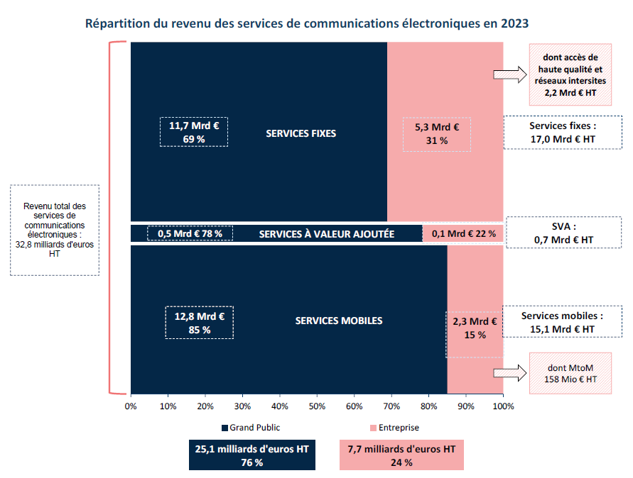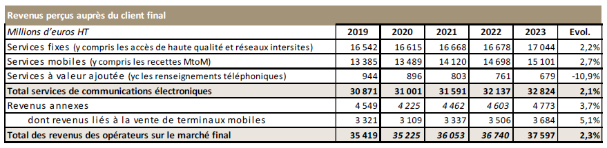 Au total, le revenu des services de communications électroniques (hors revenus annexes) enregistre, sur le marché résidentiel, une hausse de 0,4 point de croissance en 2023 (25,1 milliards d’euros HT, + 3,5 % en un an en 2023). Sur le marché entreprise, la baisse du revenu des services de communications électroniques se maintient depuis deux ans à - 2 % par an, en partie en raison du recul lié à la vente des services fixes bas débit (- 15 % en 2023), qui représente encore 15 % du revenu des services fixes perçu auprès des entreprises.
