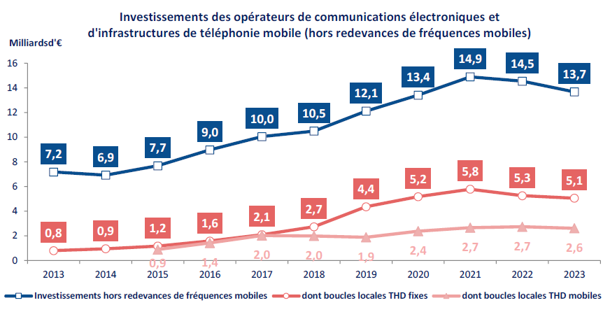 Les investissements des opérateurs restent élevés, malgré une baisse de 6 % en 2023