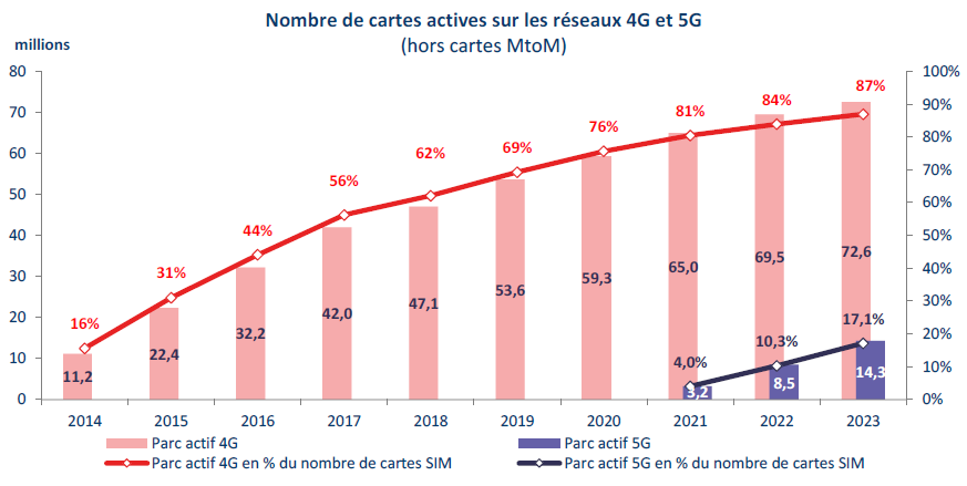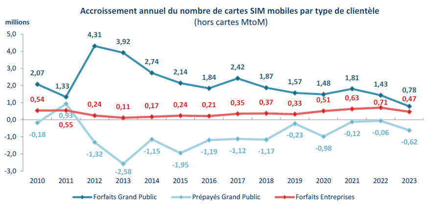 La croissance du nombre de forfaits mobiles en service ralentit depuis 2022 (+ 2 % environ en 2023 contre + 3 % à + 4 % par an depuis 2015 en raison de l’affaiblissement de la croissance du marché grand public. Après une année 2021 exceptionnelle (+ 1,8 million de forfaits grand public en un an après + 1,5 million environ sur la période 2019-2020), la croissance annuelle s’affaiblit pour s’établir à + 780 000 forfaits. En revanche, sur le segment des entreprises, le rythme de croissance reste soutenu malgré un ralentissement en 2023 (+ 4 %, après + 7 % en 2022). Cette croissance du nombre de cartes SIM dédiées aux entreprises est en partie due au recours accru au télétravail ces dernières années : environ + 470 000 forfaits en un an après + 650 000 par an en 2021 et 2022, contre environ + 300 000 les trois années précédentes. Au total, 11,7 millions de lignes mobiles entreprises sont en service en 2023. Au total, 83,4 millions de cartes SIM sont en service en France au 31 décembre 2023, dont plus de neuf cartes sur dix sont des forfaits (76,3 millions). Près de neuf cartes SIM sur dix sont actives sur les réseaux 4G (72,6 millions, + 3,1 millions en un an) et 17 % sur les réseaux 5G (14,3 millions, + 5,8 millions). En matière de dépenses en services mobiles, la facture moyenne mensuelle des entreprises (15 euros HT pour un forfait) continue de diminuer (- 4 % en un an en 2023), et est désormais inférieure à celle d’un détenteur de forfait grand public (16,1 euros HT, + 1 %).