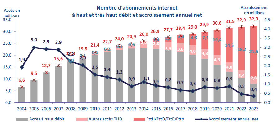 La croissance du nombre d’abonnements internet très haut débit en fibre optique reste soutenue en 2023, mais diminue depuis le milieu de l’année 2021, notamment sur le marché grand public : + 3,1 millions en un an en 2023 contre + 3,9 millions deux ans auparavant. Les abonnements en fibre optique remplacent principalement les abonnements internet à haut ou à très haut débit sur réseaux xDSL (8,9 millions en 2023, soit - 24 % en un an), et atteignent 21,5 millions fin décembre 2023. La proportion de cette technologie dans le total des accès internet très haut débit est pratiquement équivalente pour les deux types de clientèle : 89 % pour la clientèle grand public (+ 5 points en un an) et 84 % pour la clientèle entreprise (+ 4 points). Le nombre d’accès internet à haut et très haut débit souscrits par les entreprises, 2,1 millions en 2023, croît à un rythme annuel de 0,4 % en un an, un rythme trois fois moins élevé que celui des particuliers (1,3 %, soit 30,3 millions d’abonnements). La France compte ainsi 32,3 millions d’abonnements internet à haut et très haut débit fin décembre 2023. La croissance de ces abonnements ralentit à nouveau en 2023 : + 1 % en un an environ contre + 1,5% en 2022, après sept années de croissance comprise entre 2 % et 4 %.