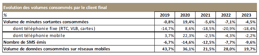 La consommation vocale depuis les réseaux fixes et mobiles, 225 milliards de minutes en 2023, diminue sans discontinuer depuis 2014 (- 4,5 % en un an en 2023), à l’exception de l’année 2020 où la croissance avait atteint un taux record de + 19 % en raison de la crise sanitaire. En 2023, un particulier disposant d’un téléphone mobile consomme en moyenne 3h28 par mois, tandis que son usage vocal depuis une ligne fixe, en déclin depuis 2013, s’établit à 49 minutes par mois en moyenne.