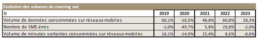 La consommation de données mobiles progresse de 20 % en 2023. Cette croissance qui n’avait pas cessé de s’accélérer au cours de l’année 2022, ralentit en 2023. Le volume moyen de données consommées sur les réseaux mobiles par les particuliers augmente de 19 % en 2023 pour atteindre 15,7 Go par mois. Plus modéré pour les entreprises, le volume moyen de données consommées sur les réseaux mobiles s’accroît de 13 % et s’établit à 5,6 Go par mois.Le trafic consommé à l’étranger par les clients des opérateurs français qui avait chuté en 2020 (- 17 %) progresse pour la troisième année consécutive, à un rythme soutenu (+ 28 % en 2023, après + 60 % en 2022 et + 49 % en 2021).