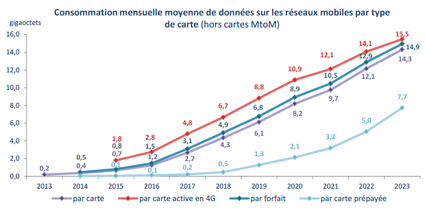 La consommation de données mobiles par carte SIM atteint 15 gigaoctets par mois en 2023