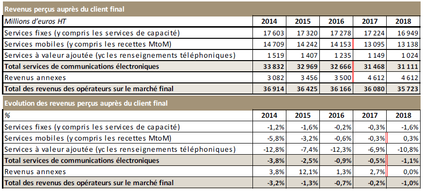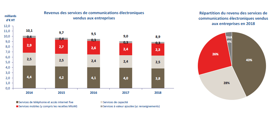 Le revenu sur le marché des services de télécommunications vendus aux entreprises diminue de 1,5% en un an en 2018 tout comme celui du marché grand public (-1,0%).