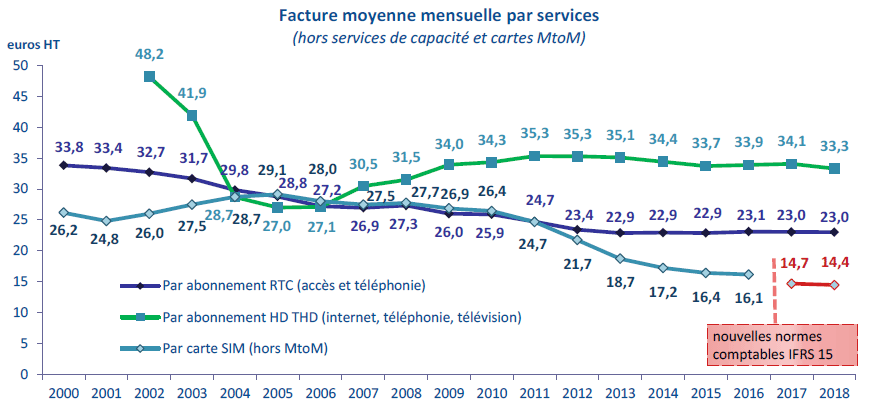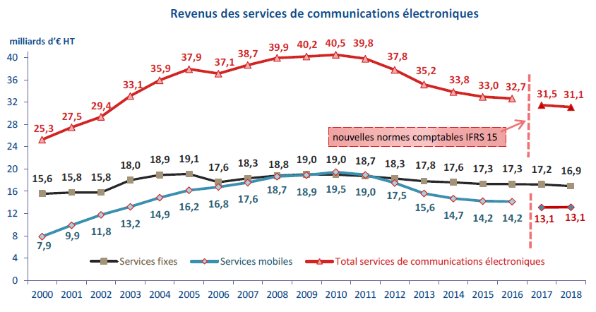 - En 2018, l’application, à partir du 1er janvier 2018, de la nouvelle norme comptable IFRS 15 a entraîné une rupture de séries dans les revenus des services mobiles et des terminaux mobiles. La partie liée au remboursement des terminaux est désormais enregistrée comptablement en totalité à la date de son achat par le client, dans les revenus des terminaux. Auparavant, ce montant (la « subvention opérateur ») était facturé au travers de l’abonnement mensuel du client pour la période d’engagement. Afin d’évaluer les évolutions entre 2017 et 2018, sur un périmètre comparable, les revenus mobiles de l’année 2017 sont également présentés dans la présente publication selon la nouvelle norme comptable IFRS 15. Pour plus d’informations, se reporter à l’annexe 2.2.