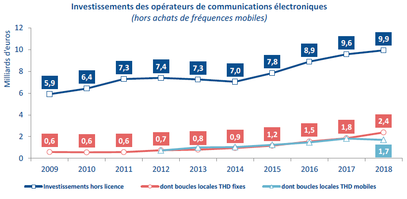 Depuis 2015, les montants investis par les opérateurs de communications électroniques n’ont cessé de progresser et c’est encore le cas en 2018, où le niveau global se situe juste en dessous des 10 milliards d’euros. En 2018, la croissance est portée en quasi-totalité par le déploiement des boucles locales à très haut débit fixes (+28,8% en un an), en particulier celles en fibre optique de bout en bout. En revanche, après le niveau exceptionnel atteint en 2017 pour le déploiement des boucles locales mobiles à très haut débit, les montants investis diminuent sensiblement en 2018, de 7% environ.