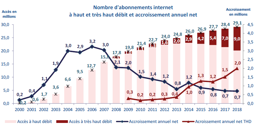 Depuis quatre ans, les consommateurs s’abonnent exclusivement à internet via des forfaits qui donnent l’accès au très haut débit, et principalement au FttH. Ils sont 1,5 million de plus à avoir contracté un forfait FttH en 2018, ce qui monte le nombre d’abonnés à cette technologie à 4,8 millions. Au total, 9,0 millions d’accès internet sur les 29,1 millions souscrits en France en 2018 sont à très haut débit (FttH, fibre optique avec terminaison coaxiale, VDSL2, etc.). Le haut débit reste encore majoritaire, en particulier la technologie DSL qui représente deux tiers des accès à haut et très haut débit souscrits (-6 points en un an). Les offres des opérateurs sont variées, avec ou sans engagement, et sont construites en général sous forme de packages ; outre l’accès à internet, elles incluent le service téléphonique et peuvent également inclure le service audiovisuel ou des contenus optionnels, par exemple des chaînes supplémentaires, des services de presse numérique, etc. En moyenne, un consommateur a dépensé 33,3 euros HT par mois en 2018 pour l’utilisation de l’ensemble de ces services, soit 80 centimes de moins qu’en 2017. La consommation moyenne de communications vocales à partir des lignes fixes (2h10 en 2018) ne cesse de se réduire et a été divisée par deux en dix ans, les consommateurs privilégiant d’autres moyens de communications comme la téléphonie sur les réseaux mobiles ou les appels téléphoniques via les applications proposées par les acteurs OTT.