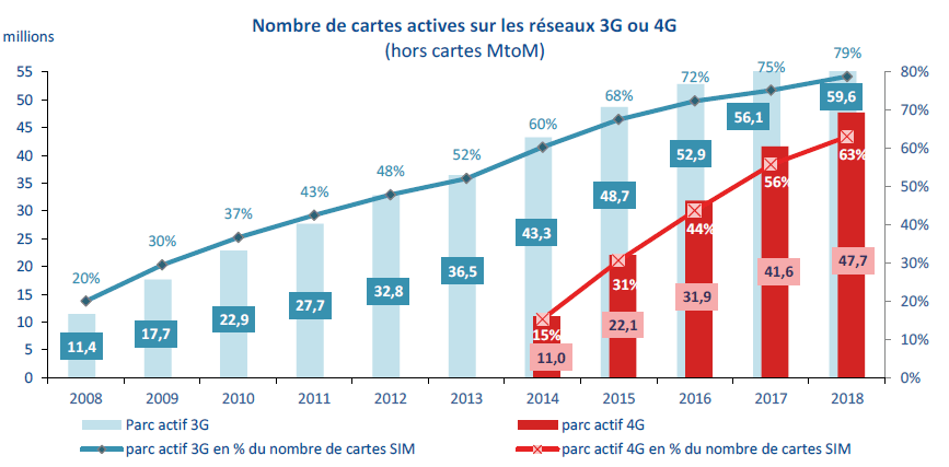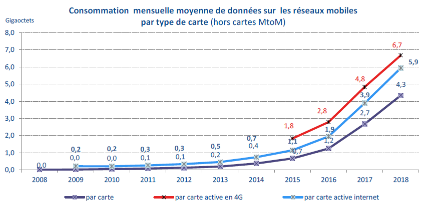 Le nombre de cartes SIM liées au marché des objets connectés (18,2 millions en 2018) augmente également : de plus de 3 millions en un an ces deux dernières années, soit les plus fortes croissances jamais enregistrées.