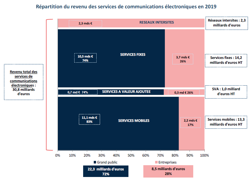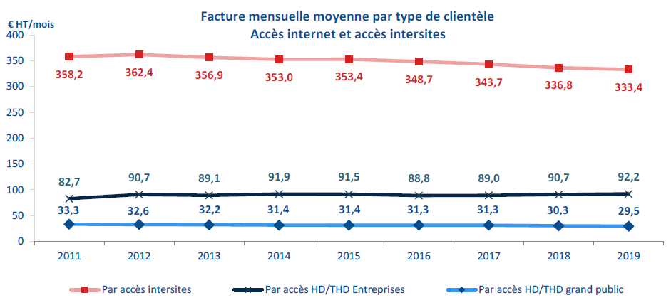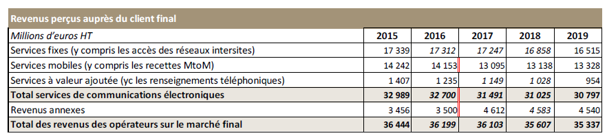 Le revenu des services fixes (internet, téléphonie, accès des réseaux intersites pour les entreprises) a repris sa tendance à la baisse depuis 2018, après une période 2016-2017 quasi stable. En effet, le revenu lié aux ventes des accès à haut et très haut débit (11,8 milliards d’euros)est stable depuis 2018 après des croissances fluctuant de 1 à 3% par an depuis 2013. Cette modification de tendance se concentre sur le marché résidentiel, et est liée en partie aux offres promotionnelles ayant eu lieu en 2018, notamment sur le DSL. Sur le marché entreprise, le revenu lié à la vente des accès aux entreprises (internet à haut et très haut débit, et réseaux intersites) s’élèvent à 4,6 milliards d’euros HT en 2019, et est pratiquement stable depuis 2015.