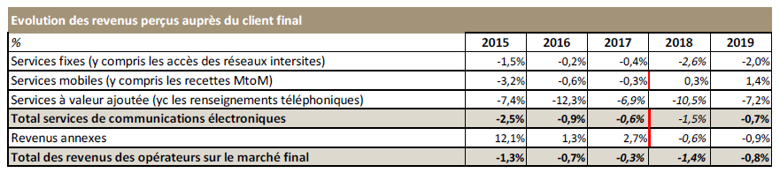 Au total, le revenu des services fixes et mobiles (y compris les services à valeur ajoutée) est stable sur le marché résidentiel après une année 2018 en baisse de 1% en un an. Il est en revanche en recul de 3% à 4% par an depuis 2014 sur le marché entreprise, en raison de la baisse des revenus des services mobiles, des accès des réseaux intersites (-2% en un an), du revenu lié au service téléphonique bas débit (-12%), ce dernier représentant près d’un quart du revenu des services fixes perçu auprès des entreprises (contre 9% pour les résidentiels).