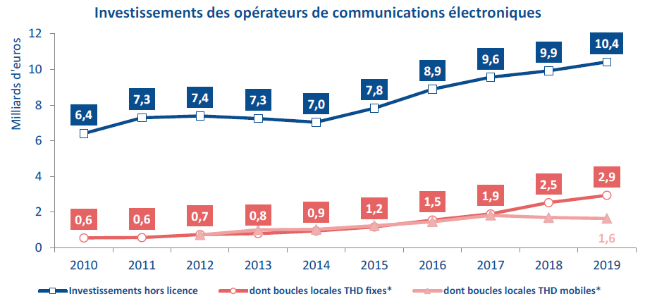 Avec 10,4 milliards d’euros, les investissements progressent de 510 millions d’euros en 2019, une croissance en niveau supérieure à celle de 2018 (+360 millions d’euros). Elle provient, d’une part, de la plus forte augmentation des dépenses d’investissements liées à l’activité fixe (+660 millions d’euros en un an contre +560 millions en 2018). D’autre part, les investissements liés à l’activité mobile continuent de reculer, mais dans une moindre mesure en 2019 (-150 millions d’euros en un an contre -200 millions d’euros l’année précédente). A l’image de 2018, les déploiements dans les boucles locales fixes à très haut débit, et en particulier en fibre optique de bout en bout, constituent le premier poste de dépenses des opérateurs et celui qui progresse le plus (+410 millions d’euros).