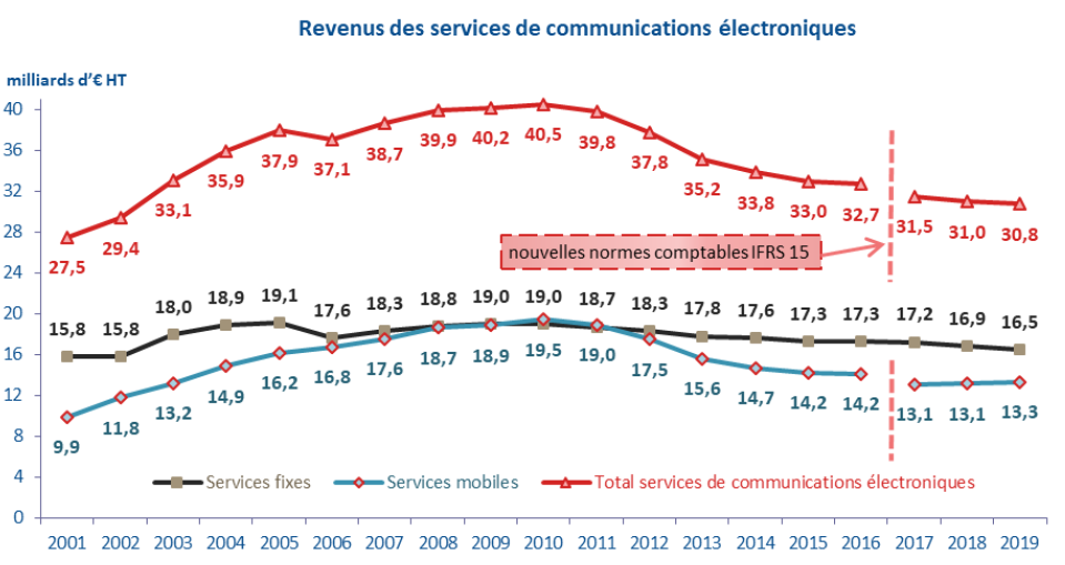 Le revenu des opérateurs de services de communications électroniques (30,8 milliards d’euros HT) diminue faiblement en 2019 grâce à une amélioration sur le marché résidentiel.