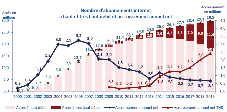 Depuis cinq ans, les consommateurs s’abonnent exclusivement à internet via des forfaits qui donnent l’accès au très haut débit, et principalement la fibre optique de bout en bout. Ils sont 2,3 millions de plus à avoir contracté un forfait FttH en 2019, ce qui monte le nombre d’abonnés à cette technologie à 7,1 millions sur un total de 11,4 millions d’accès à très haut débit ; la fibre optique de bout en bout prédomine quel que soit le type de clientèle : 62% des accès à très haut débit sur le grand public et 57% pour les entreprises. Au total, le nombre d’accès internet vendus à des entreprises s’élève à 2,1 millions ; en croissance de 0,5% en un an, ce dernier augmente moins rapidement que pour la clientèle résidentielle (27,8 millions, +2,4%). La France compte ainsi 29,8 millions d’accès à internet à haut et très haut débit en 2019, dont une majorité à haut débit, en particulier de technologie DSL (60%, soit -7 points en un an).