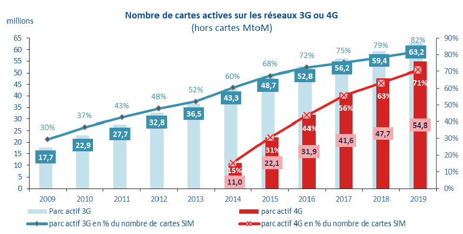 Les réseaux 4G permettent en effet des vitesses de chargement de données plus rapides : 54,8 millions de clients, soit +7 millions, les ont utilisés à la fin de l’année 2019, ce qui représente un peu plus de sept cartes SIM sur dix (+8 points en un an). Parallèlement, le nombre de cartes SIM (77,2 millions) continue de progresser (+2%), porté par la croissance des forfaits, que cela soit sur le marché résidentiel (59,1 millions de forfaits, +2,7% en un an) ou pour les entreprises. Le nombre de lignes de ces dernières (9,3 millions) augmente de 3 à 4% par an depuis 2015 (+3% en 2019), tout comme leurs abonnements téléphoniques en voix sur large bande (3,4 millions, +4%) ; ils viennent ainsi remplacer progressivement ceux en bas débit (4,7 millions, -9%), dont les entreprises sont encore équipées en majorité (58% des 8,1 millions d’abonnements téléphoniques fixes), au contraire de la clientèle résidentielle (11% des 29,8 millions). En matière de dépenses en services mobiles, la facture moyenne mensuelle des entreprises (19,3 euros HT par forfait) est supérieure de 4 euros à celle du grand public, même si l’écart tend à diminuer d’année en année en raison de la baisse continue de la facture des entreprises (-7,2% en un an en 2019).