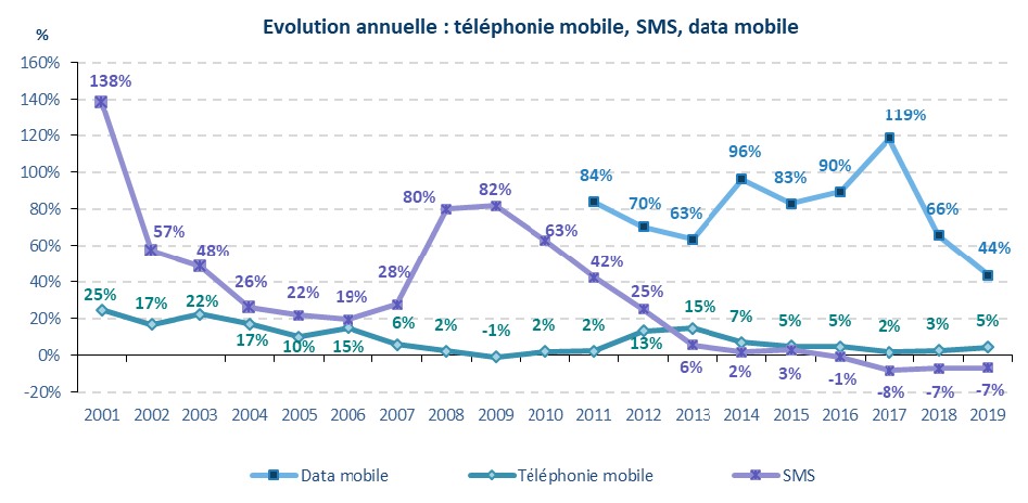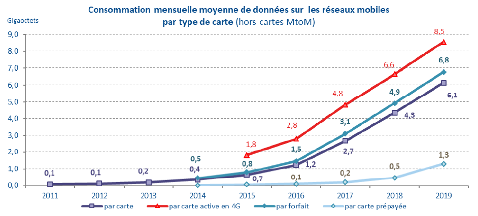 L’usage mensuel moyen de données sur réseaux mobiles atteint jusqu’à 8,5 gigaoctets par carte SIM et par mois pour un client actif 4G, soit +30% en un an. Les entreprises (3,3 Go, +46%) consomment moins que les résidentiels (7,3 Go pour un forfait),même si pour la première fois en 2019, elles enregistrent une croissance annuelle supérieure de près de 10 points par rapport à celle des résidentiels. En outre, l’utilisation du service SMS est en perte de vitesse pour les résidentiels, dont la consommation de messages (231 par mois et par forfait) diminue de près de 10% par an depuis 2017. Les entreprises, quant à elles, ont stabilisé leur consommation à environ 90 messages par mois depuis 2016.