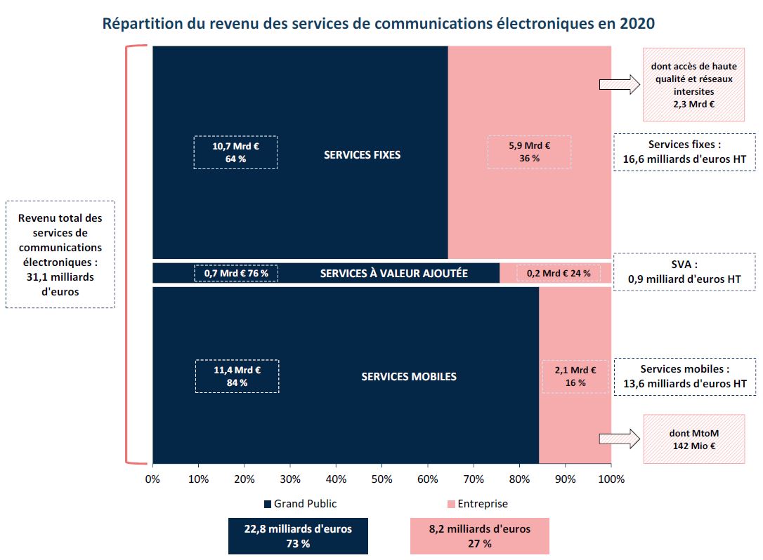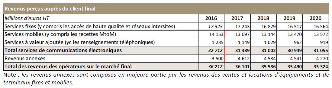 Au total, le revenu des services fixes et mobiles (y compris les services à valeur ajoutée) double sa croissance en un an en 2020 sur le marché résidentiel (22,8 milliards d’euros HT, + 2 % en un an en 2020), tandis qu’il continue de diminuer sur le marché entreprise (8,2 milliards d’euros HT, - 4 % en 2020 après - 3 % en 2019), en raison de la baisse des revenus des services mobiles, des accès de haute qualité et réseaux intersites (- 1,4 % en un an) et du revenu lié au service téléphonique bas débit (- 10 %), ce dernier représentant 22 % du revenu des services fixes perçu auprès des entreprises (contre 8 % pour les résidentiels).