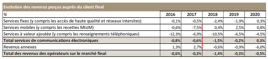 Cependant, malgré la pandémie, sur les seuls services de communications électroniques, le revenu progresse légèrement (+ 0,3 % en un an). Le revenu des services fixesaugmente à nouveau après dix années de recul quasiment continu (+ 0,3 % en un an en 2020) grâce à un regain de croissance du revenu lié à la vente des abonnements à haut et très haut débit sur le marché grand public (+ 3 % en un an après deux années à environ - 0,5 %). Sur le marché entreprise, le revenu lié à la vente des accès (internet à haut et très haut débit, accès de haute qualité et réseaux intersites), 4,6 milliards d’euros HT en 2020, est pratiquement stable depuis 2015. A l’inverse, la croissance du revenu lié à la commercialisation des services mobiles ralentit (+ 0,8 % en un an en 2020 contre + 2,5 % un an auparavant), principalement en raison de la diminution exceptionnelle des usages en roaming out due aux restrictions de déplacements, et notamment de la clientèle entreprise, pour laquelle le revenu des services de roaming out contribue de manière massive à la chute des revenus issus des services mobiles (‑ 7 % en 2020 après - 3 % en 2019).