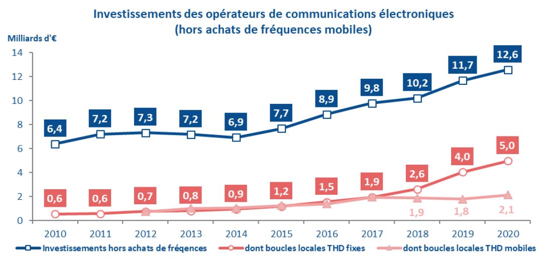 Les montants investis par les opérateurs de communications électroniques atteignent 15,4 milliards d’euros en 2020.